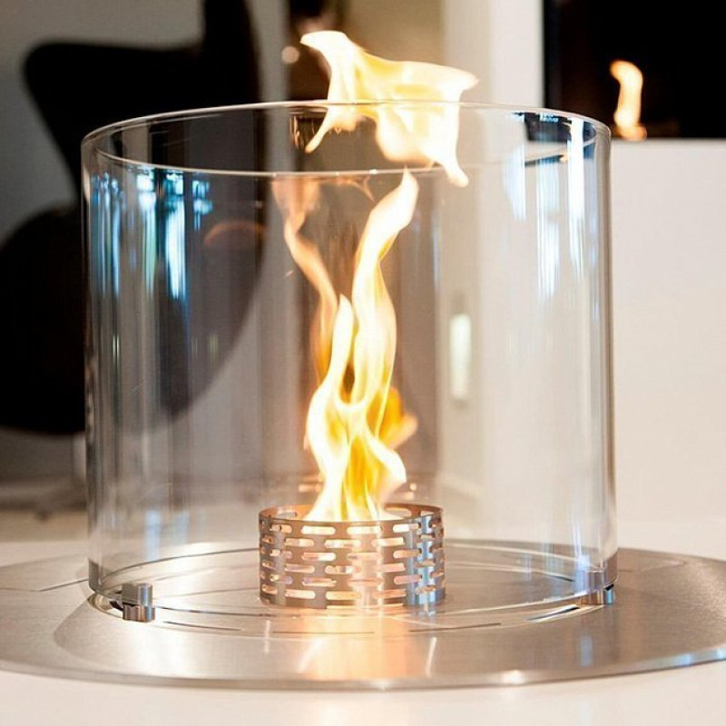 Стеклянный цилиндр толщиной 8 мм, окружающий горелку, не помешает любоваться живым огнем. Наоборот, защитит его от сквозняков и не допустит затухания. В горелке реализована технология CEVB (контролируемое горение паров биоэтанола), это обеспечивает экономичность камина и безопасность для пользователей.