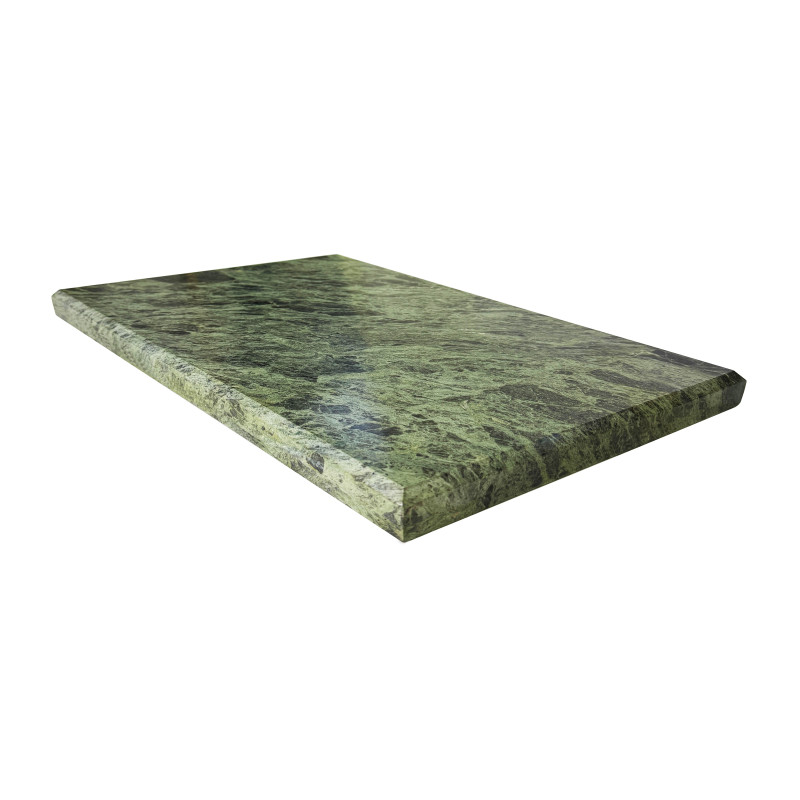 Плитка из змеевика является наилучшим материалом для отделочных работ внутри саун и бань, а также облицовки печей. Цвет плитки - от светло до темно-зеленого с характерными прожилками похожими на кожу змеи. Целительные свойства плитки заключаются в том, что камень обладает уникальными противовоспалительными свойствами. В парной, где есть плитка из змеевика, повышается иммунитет, снимаются воспалительные процессы, очищаются органы дыхания, улучшается работа внутренних органов, укрепляется нервная система. Сам камень часто используют как банный, а особые ценители предпочитают облицовывать печь или парильное помещение именно плиткой, чтобы обеспечить себе безопасное парение и эффектно подчеркнуть достоинства своей парной. В нем нет никаких негативных испарений, что делает камень абсолютно экологически чистым! Змеевик прекрасно аккумулирует тепло, равномерно распределяя жар по всей парилке.